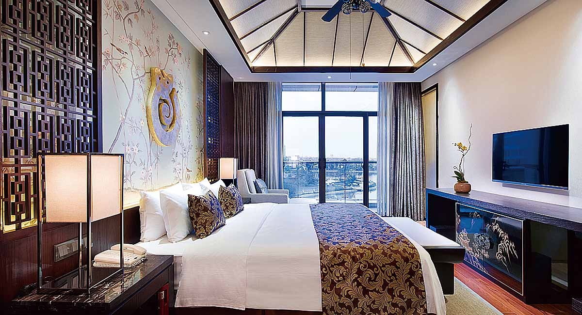 藍溪度假大酒店將古代建筑的經(jīng)典元素提煉并加以豐富,借鑒現(xiàn)代建筑風格的時尚與潮流,以現(xiàn)代人的審美需求來打造富有傳統(tǒng)韻味的空間,給傳統(tǒng)居住文化注入了新的氣息。無論是寫意的休息室,還是詩意的套房,都追求人與環(huán)境的美學與和諧共生:講究居住環(huán)境的穩(wěn)定、安全和歸屬感。